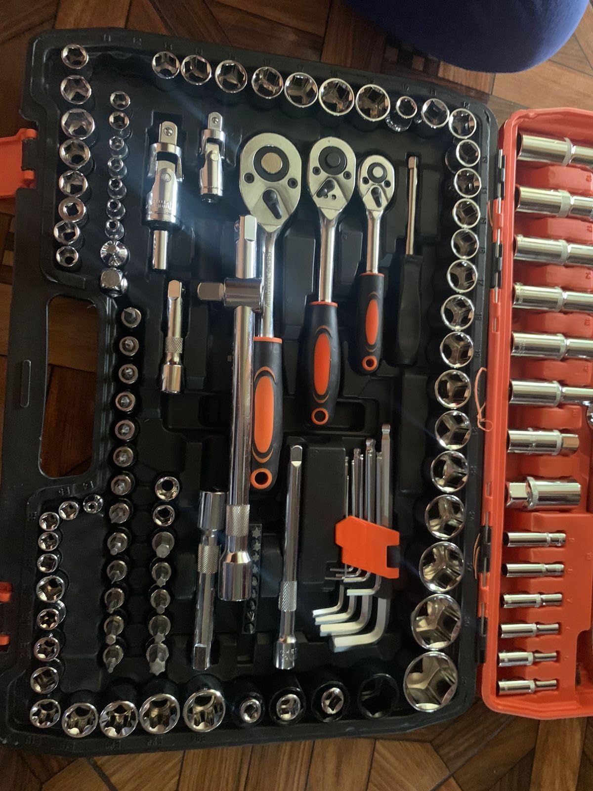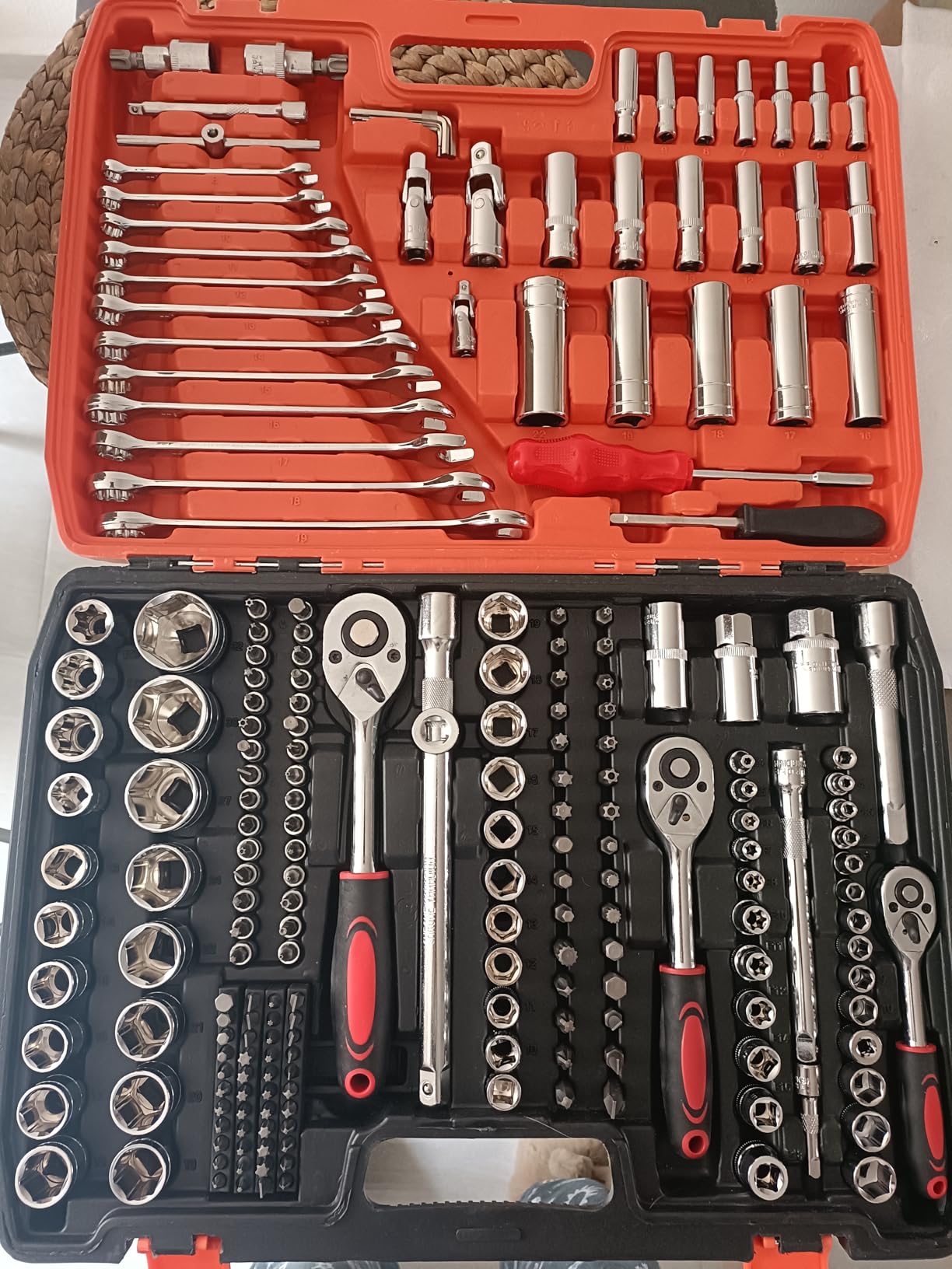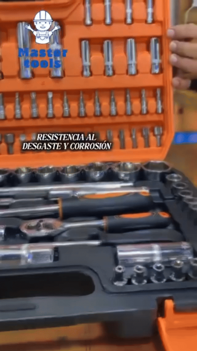 Este maletín trae 108 piezas organizadas y listas para usar: copas, extensiones, puntas, trinquetes y más. Fabricadas en acero resistente, con adaptadores para diferentes cuadrantes. Solo abre, elige la herramienta y ponte manos a la obra.